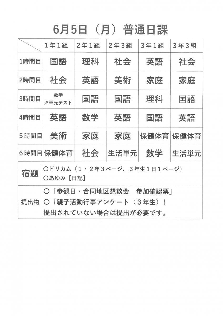 6月5日(月)の授業、宿題、提出物について