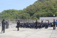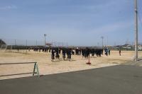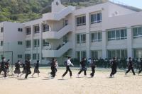 その後、地震が起こった想定で、一時避難としてグランドに集合しました。通学カバンで頭を守りながら、「おかしもち」を心掛けて、素早く移動しました。